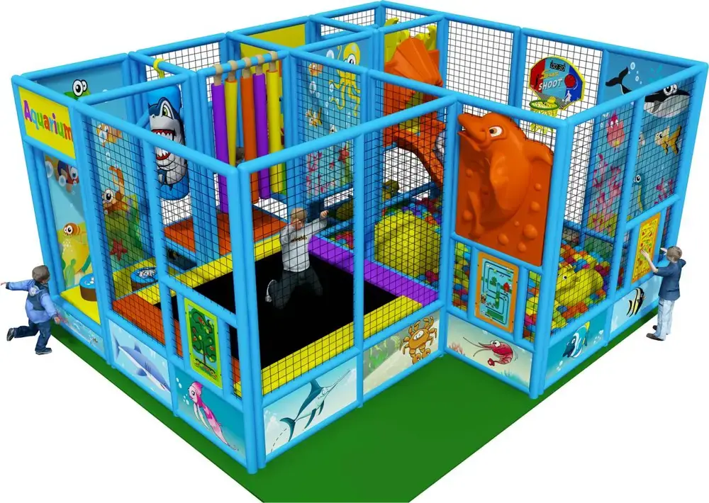 Motiv mořského světa dodává této sestavě hravý a příjemný charakter, který velmi dobře funguje v provozech orientovaných na rodiny. Barevná kompozice, tematické grafiky, měkké herní prvky a uzavřený bezpečný prostor vytvářejí kompaktní vnitřní dětské hřiště, které děti okamžitě přitáhne a zároveň nepůsobí rušivě vůči zbytku interiéru.