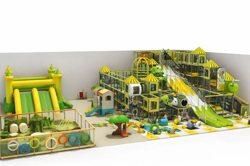 Největší předností tohoto řešení je jeho velkorysý rozsah a schopnost propojit více typů dětské zábavy do jednoho funkčního celku. Výrazná víceúrovňová konstrukce, otevřené skluzavky, průlezové tunely a doplňkové herní prvky vytvářejí prostředí, které působí jako plnohodnotné dětské zábavní centrum. Nejde tedy jen o jednu sestavu, ale o komplexnější prostor s vyšší návštěvnickou hodnotou a silnějším komerčním potenciálem.